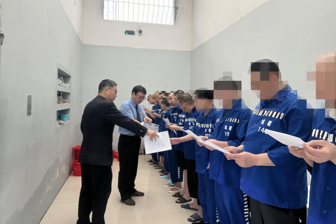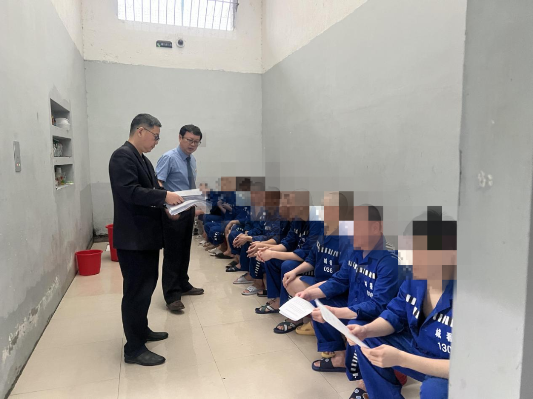 活动当天,我院检察官采取现场宣讲的方式,为南城县看守所在押人员共100余人上了一堂法治宣传课,并向在押人员发放法律宣传资料、问卷调查共计200余份。同时对在押人员开展了谈话教育,告知在押人员权利义务,了解在押人员思想动态和身体状况。检察官通过与在押人员集体谈话和个别谈话的方式,详细询问在押人员的思想、学习、生活情况,并为他们提供法律咨询服务及心理疏导,引导被他们通过合法的途径维护合法权益,勉励他们积极学习改造,早日回归社会,做一名守法公民。