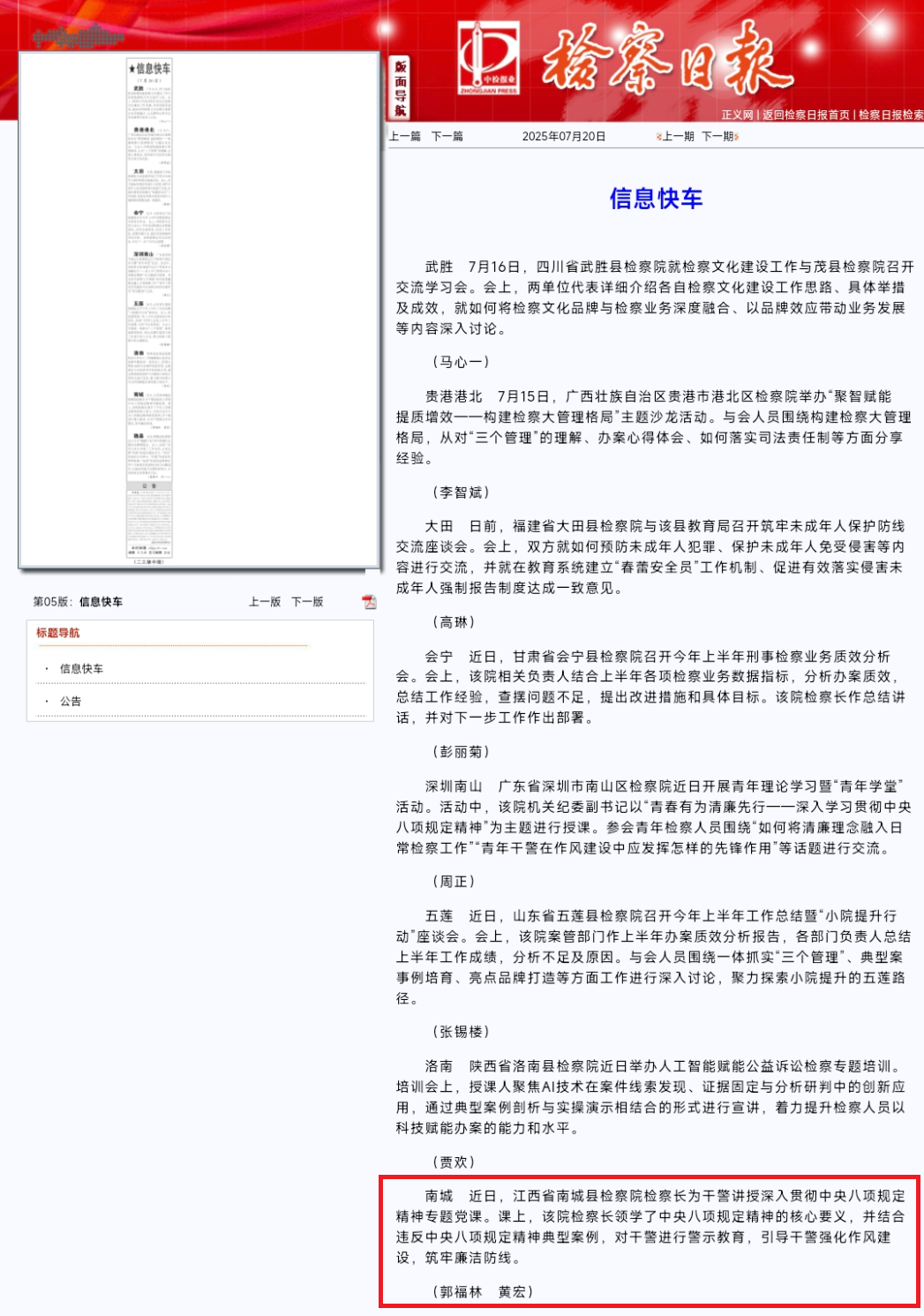 南城 近日,江西省南城县检察院检察长为干警讲授深入贯彻中央八项规定精神专题党课。课上,该院检察长领学了中央八项规定精神的核心要义,并结合违反中央八项规定精神典型案例,对干警进行警示教育,引导干警强化作风建设,筑牢廉洁防线。